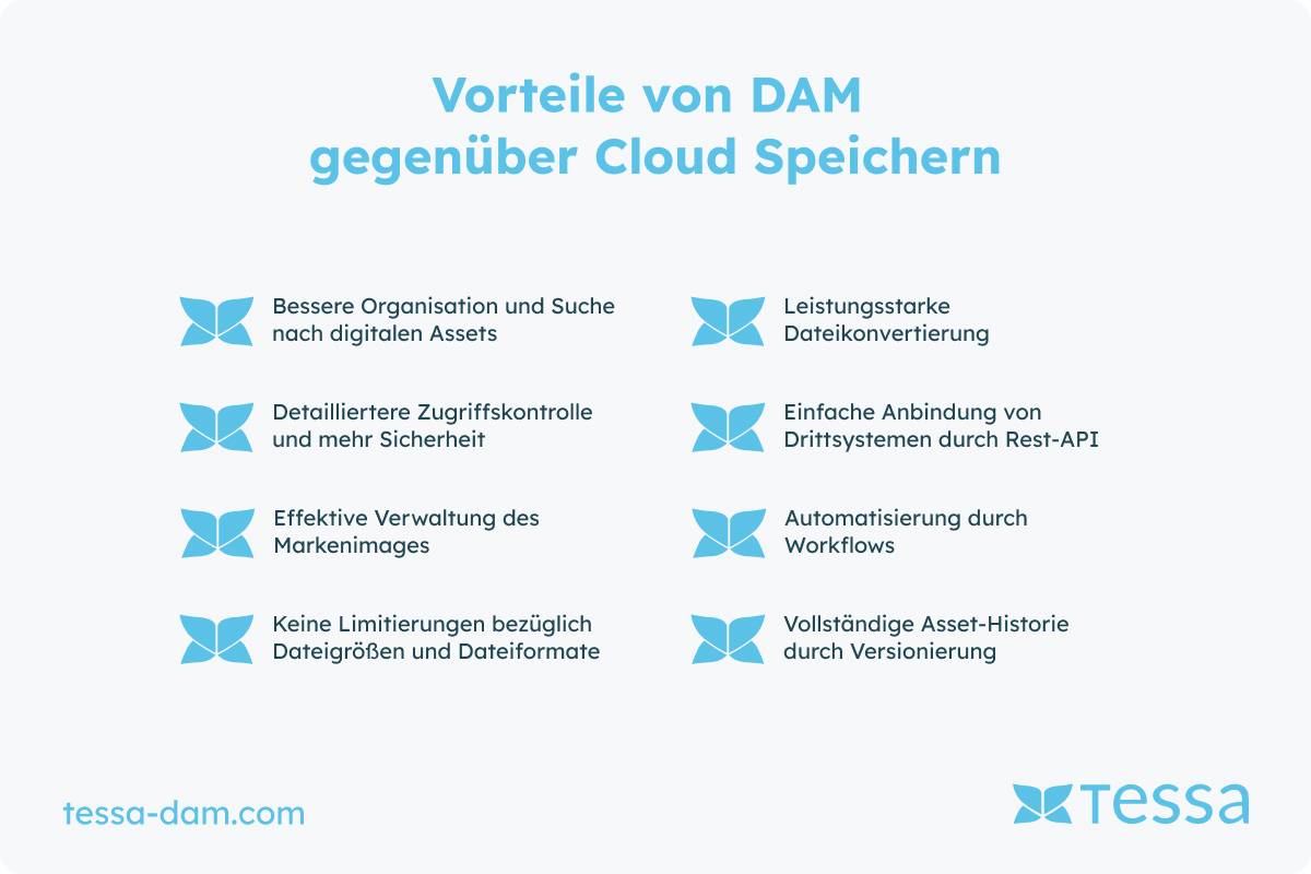 Die Vorteile von Digital Asset Management (DAM) im Vergleich zu Cloud-Speichern sind vielfältig und bieten eine Reihe von Funktionen, die speziell auf die Bedürfnisse der Verwaltung digitaler Inhalte zugeschnitten sind.