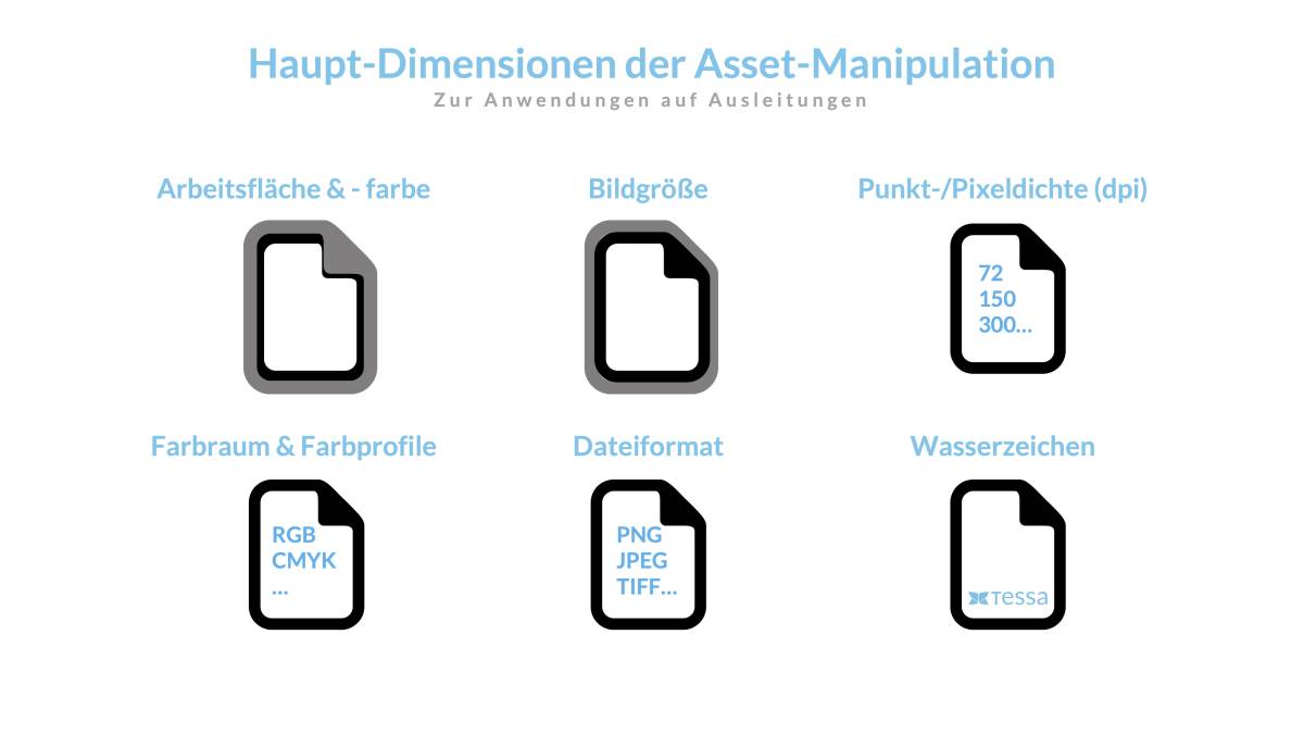 Viel angenehmer ist es doch, wenn ein Server diese Arbeit im Hintergrund macht. Dann kannst Du nicht nur Deine Website sauber mit den Assets im benötigten Format versorgen, sondern auch alle anderen Zielsysteme Deines Unternehmens. Ob das nun Deine Website ist, die Website von Kooperationspartnern, Großhändlern, Markplätze, interne Systeme wie ERPs oder CRMs – alle können das Asset-Material aus dem TESSA DAM in der Form bekommen, in der es gewünscht wird. Das ist ein enormer Wettbewerbsvorteil gegenüber Konkurrenten, die Daten nur als Standard zur Verfügung stellen und bei denen der Kunde die Arbeit übernehmen soll. Dazu musst Du natürlich die Anforderungen der Kunden und internen Stakeholdern kennen. Dann kannst Du die Aufgabe mit den TESSA Channels ganz einfach lösen – und wenn es etwas ganz Besonderes ist, das gewünscht wird, unterstützen wir gerne und versuchen jeden Wunsch umzusetzen. Wenn es komplizierter wird, können wir auch einen spezifischen Konverter einsetzen oder Assets regelbasiert kombinieren.