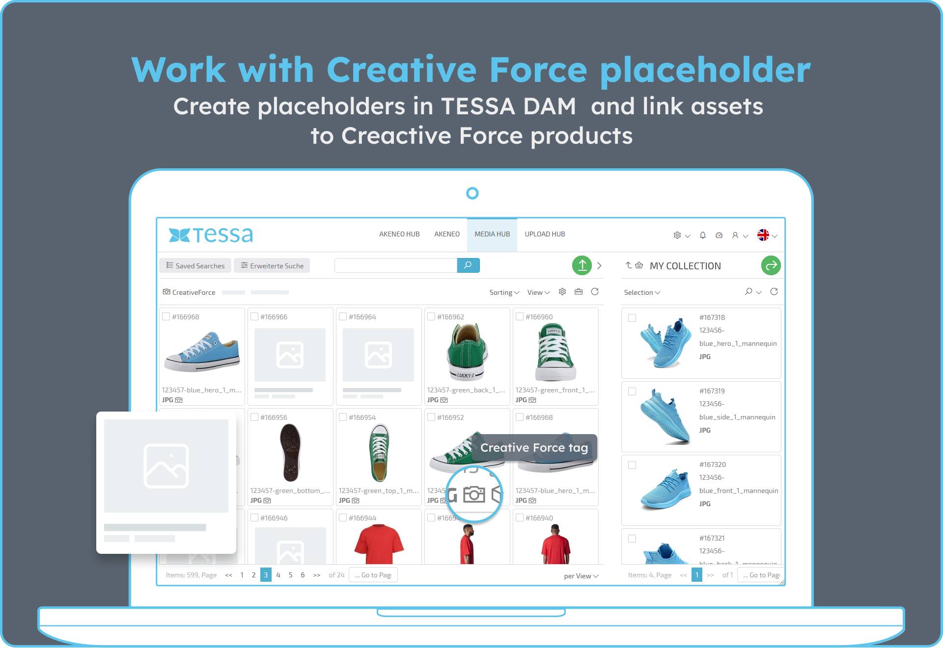 Mit unserem TESSA Creative Force Konnektor ermöglichen wir einen reibungslosen Datenaustausch zwischen beiden Systemen. Du hast die Möglichkeit, die benötigten Assets und die dazugehörigen Metadaten von Creative Force automatisch ins DAM hochzuladen und umgekehrt.