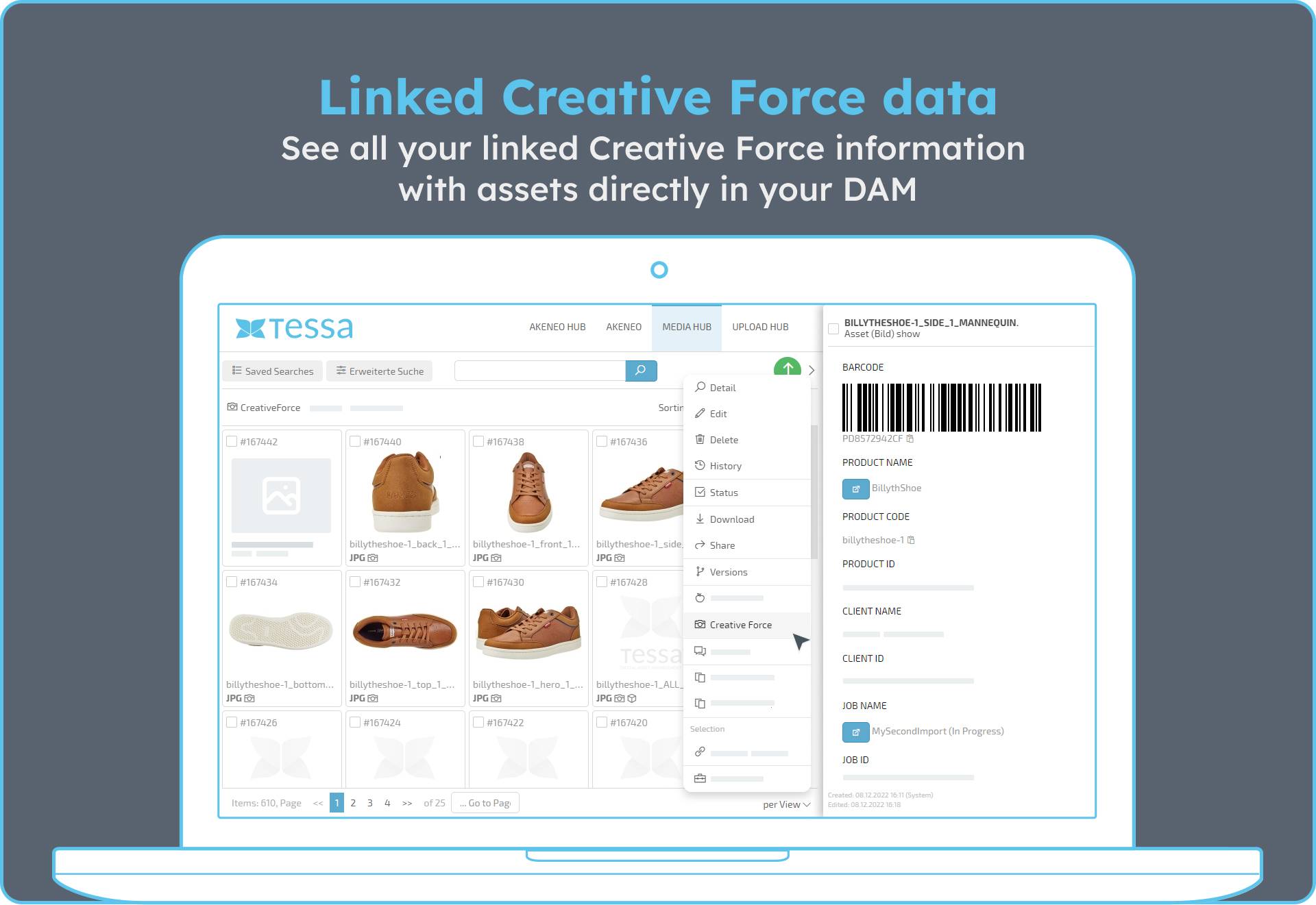 - Sobald Du ein Asset einem Produkt in Creative Force zugewiesen hast, stehen Dir alle Information von Creative Force in TESSA zur Verfügung.