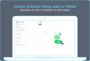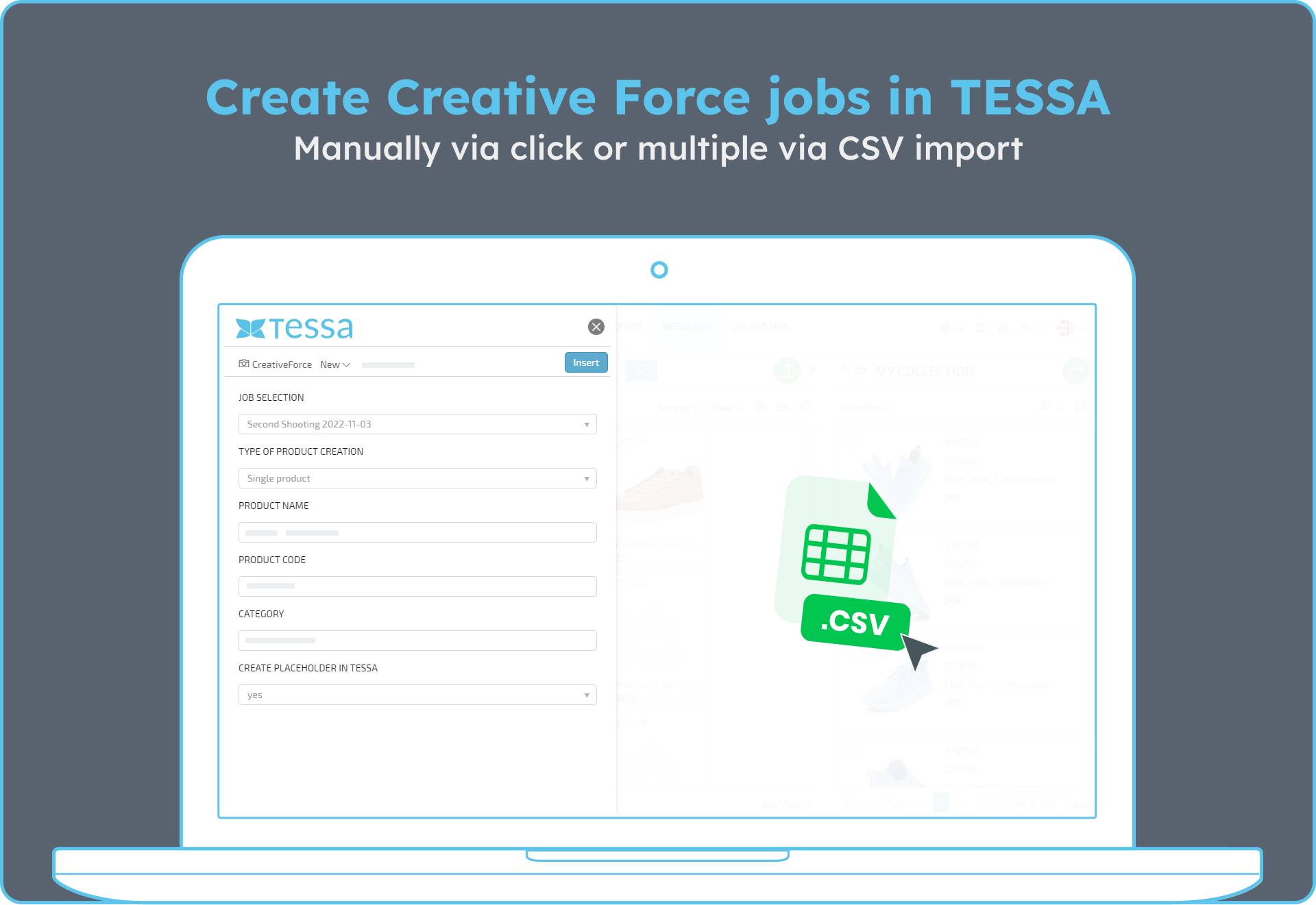 - Du kannst über einen Dialog in TESSA DAM Deine benötigten Produkte und Jobs erstellen. Einzelne Daten händisch oder mehrere via CSV.