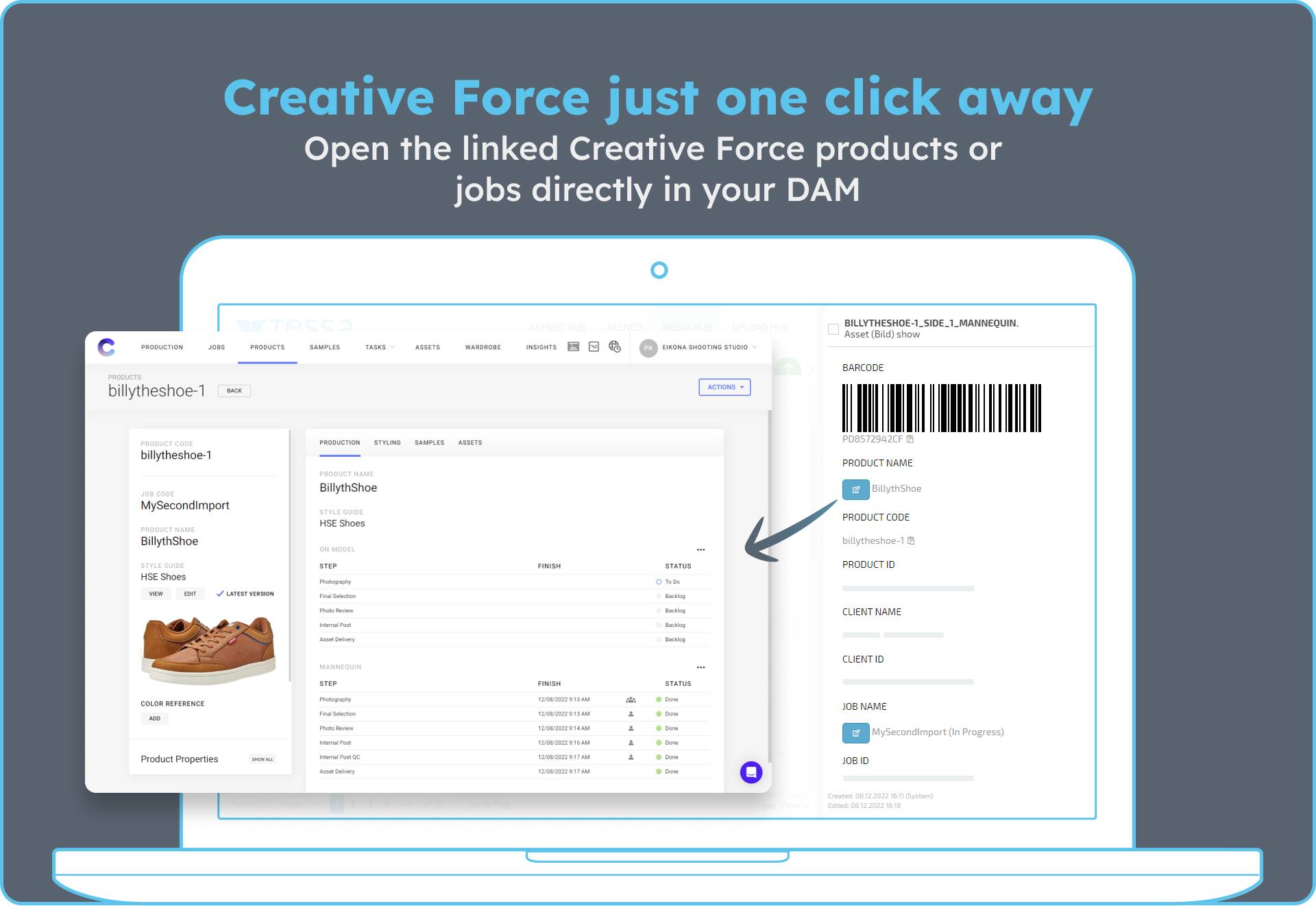 Verbinde TESSA Digital Asset Management mit der Studio-Management-Software von Creative Force. Creative Force vereinfacht und automatisiert die Foto- und Video-Produktion im E-Commerce.
