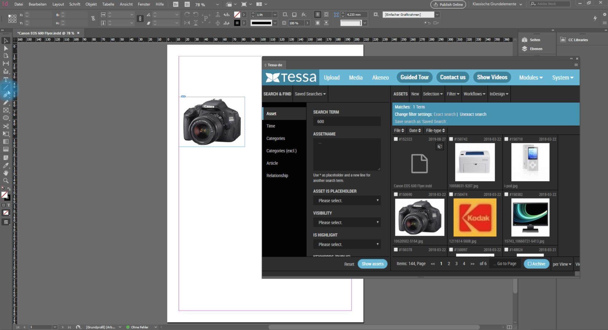 Du kannst ohne Umwege die Bibliothek durchsuchen und alle Bilder aus TESSA direkt in InDesign öffnen und bearbeiten. Zum Speichern und Upload des Dokumentes ins DAM-System musst Du InDesign nicht verlassen, sondern kannst dies direkt mit wenigen Mausklicks erledigen. So funktioniert Digital Asset Management nahtlos integriert in InDesign!
