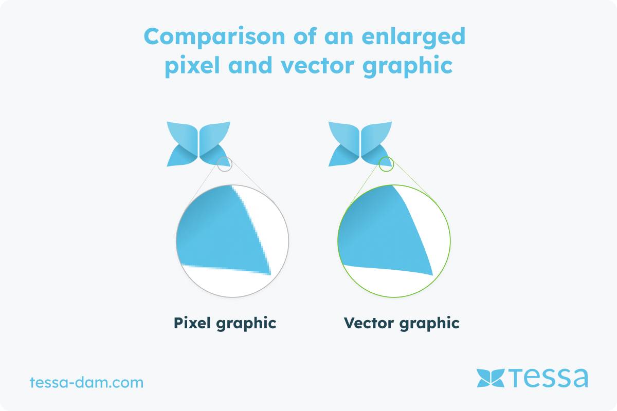 Vector graphics are constructed from lines and shapes. Typically, lines and outlines on one hand and areas on the other are colored or filled with patterns and gradients. As a result, vector graphics, unlike rasterized photos, can be resized as needed without loss of quality. Logos and practical graphics, in particular, are often created as vector graphics since they need to be displayed in various sizes. At the same time, when vector graphics are scaled up, they are usually much more data-efficient than pixel-based graphics with the same content. Important formats in this domain include EPS, SVG, PDF, and AI for 2D vector graphics. Additionally, there are 3D vector graphics.