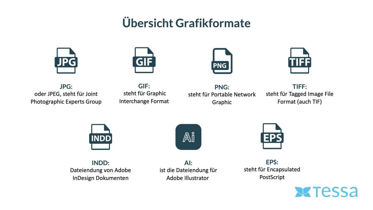 In principle, all graphic formats can be stored and managed in a Digital Asset Management (DAM) system like TESSA DAM. To achieve this, the allowed file extensions are configured in TESSA DAM, such as GIF, JPG, JPEG, SVG, PNG, EPS, AVIF, AI, INDD, and others. This means that file formats beyond graphic formats, such as DOC, XLS, XLSX, etc., can also be stored in a DAM. With the DAM, it is also possible to convert graphic formats and adjust the results to the desired size.